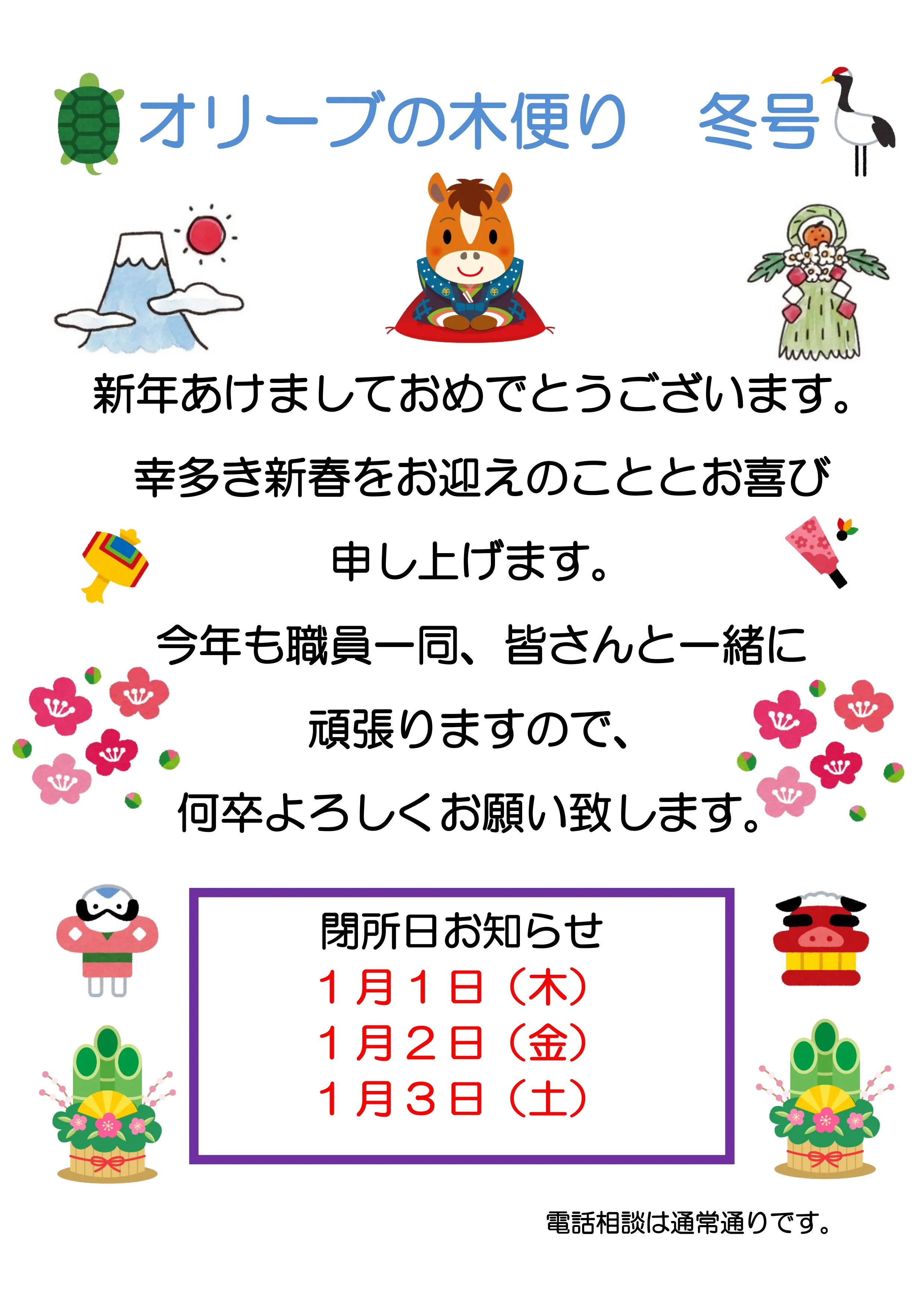 2025.12.18 【年末年始の外来休診のお知らせ】12/27(土)~1/4(日) 平素より凪の音ホスピタルをご利用頂き、誠にありがとうございます。12月27日(土曜日)から1月4日(日曜日)の期間、外来休診となります。ご迷惑をお掛けいたしますが、何卒よろしくお願い致します。