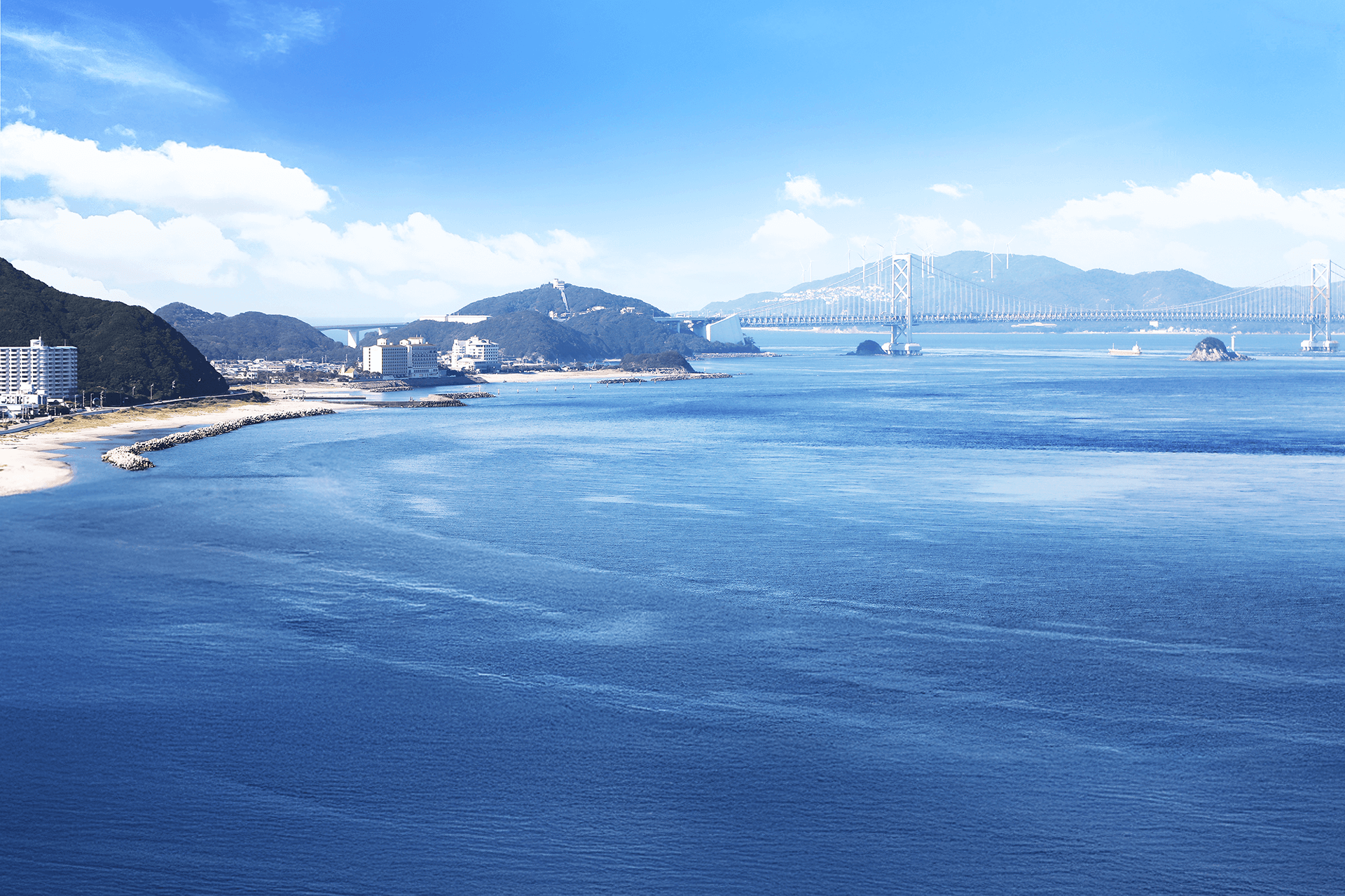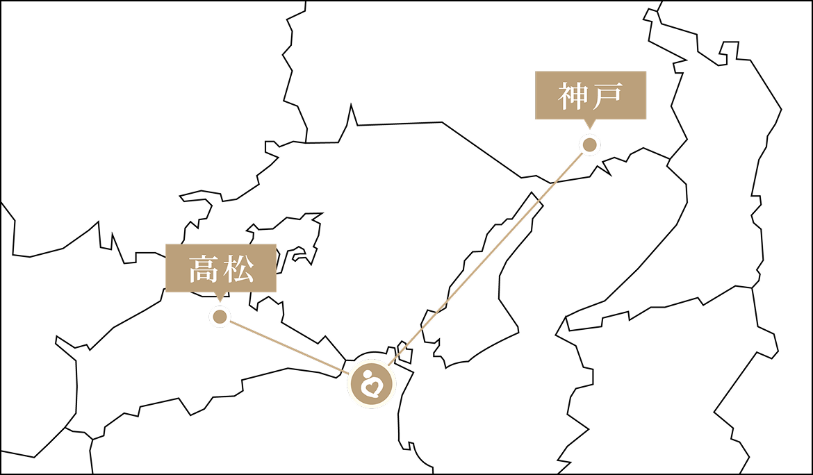 鳴門大橋から眺めた海の先、静かな岬に私たち凪の音ホスピタルはあります。鉄道、車、様々な方法で当院にアクセスする事が出来ます。